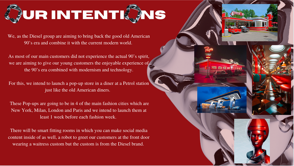 The Diesel Project was a group project within my Visual Merchandising module, where we developed an in-store pop-up concept aligned with the brand’s tone of voice and target audience. Through extensive market and brand analysis, we ensured that our concept reflected Diesel’s identity while engaging customers effectively.